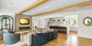Streeter Built Living Room with fireplace eat in kitchen and hardwood floors