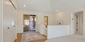 Foyer with wood floors and vaulted ceiling.