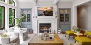 Custom livign room with fireplace, vaulted ceiling and large windows